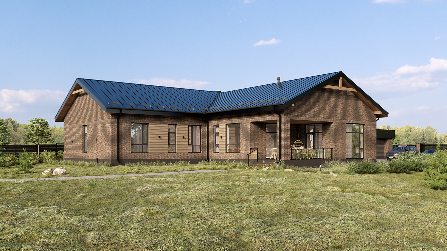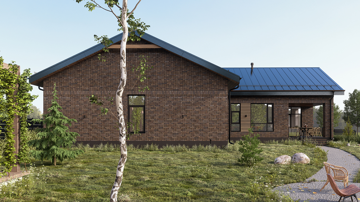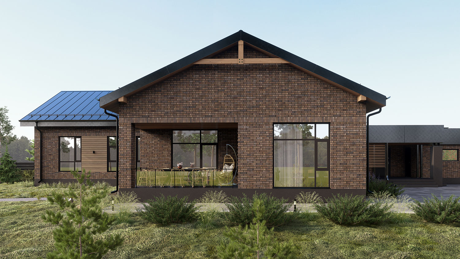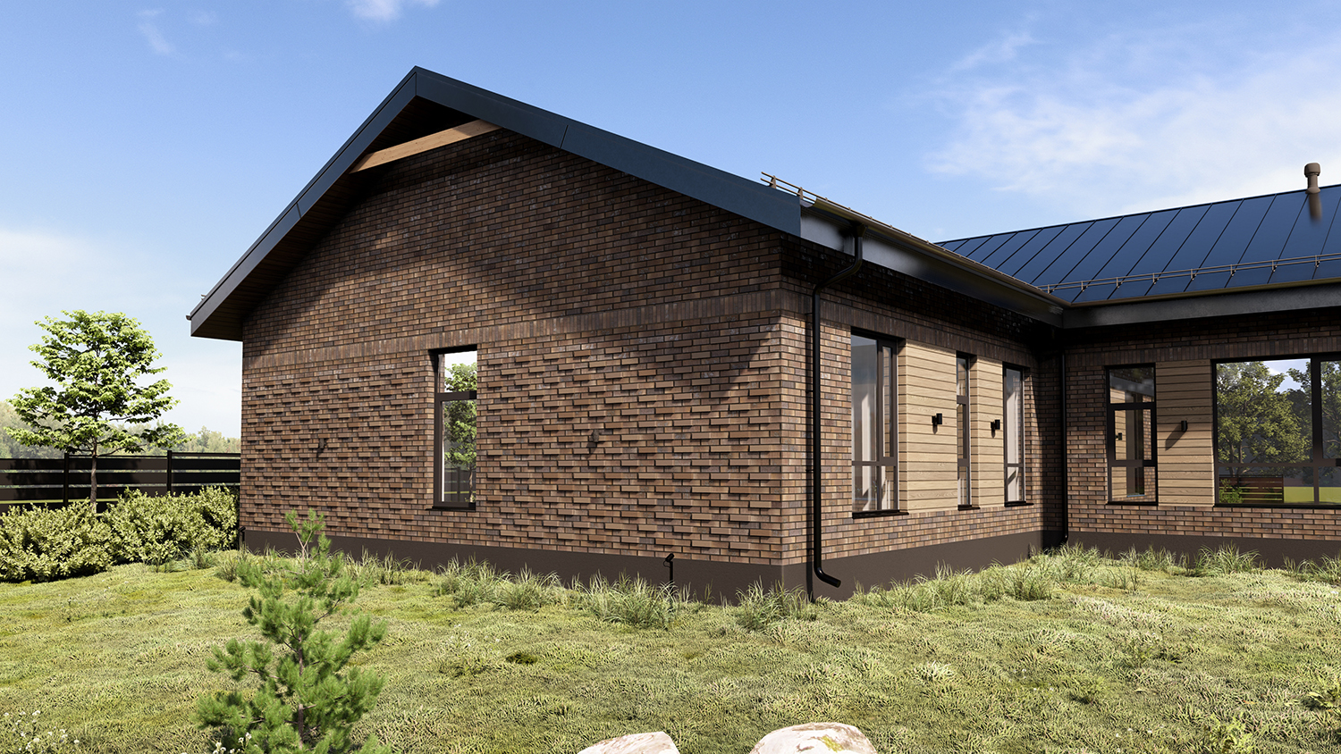 - Особенности: рельефный участок, две очереди строительства, разные фундаменты объемно-пространственных блоков. Кухня и гостиная разъединены – это было особым пожелание заказчиков.