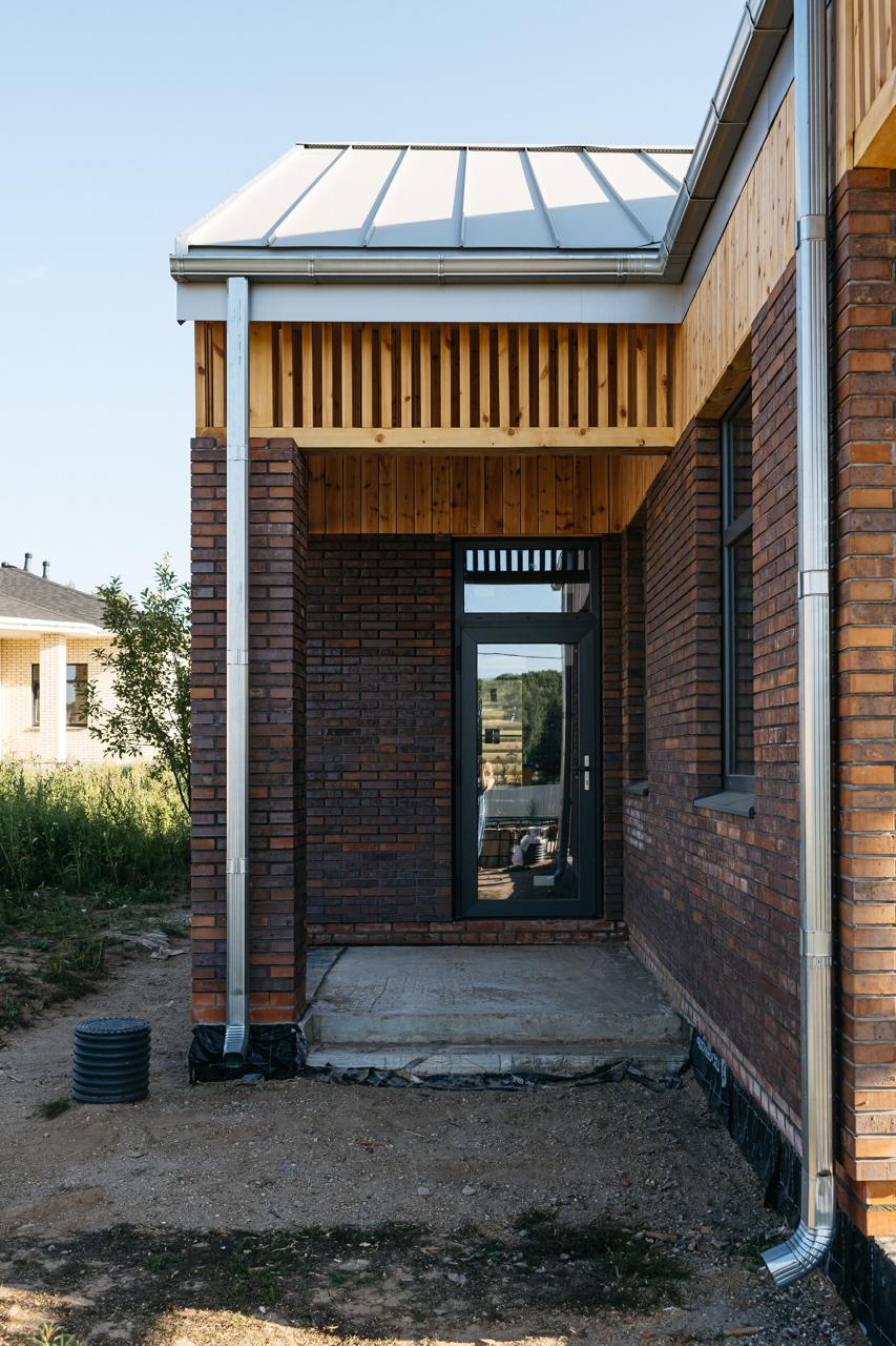 – Кровля: утепленная 250мм в зоне гостиной, покрытие — кликфальц, прямоугольная водосточка.